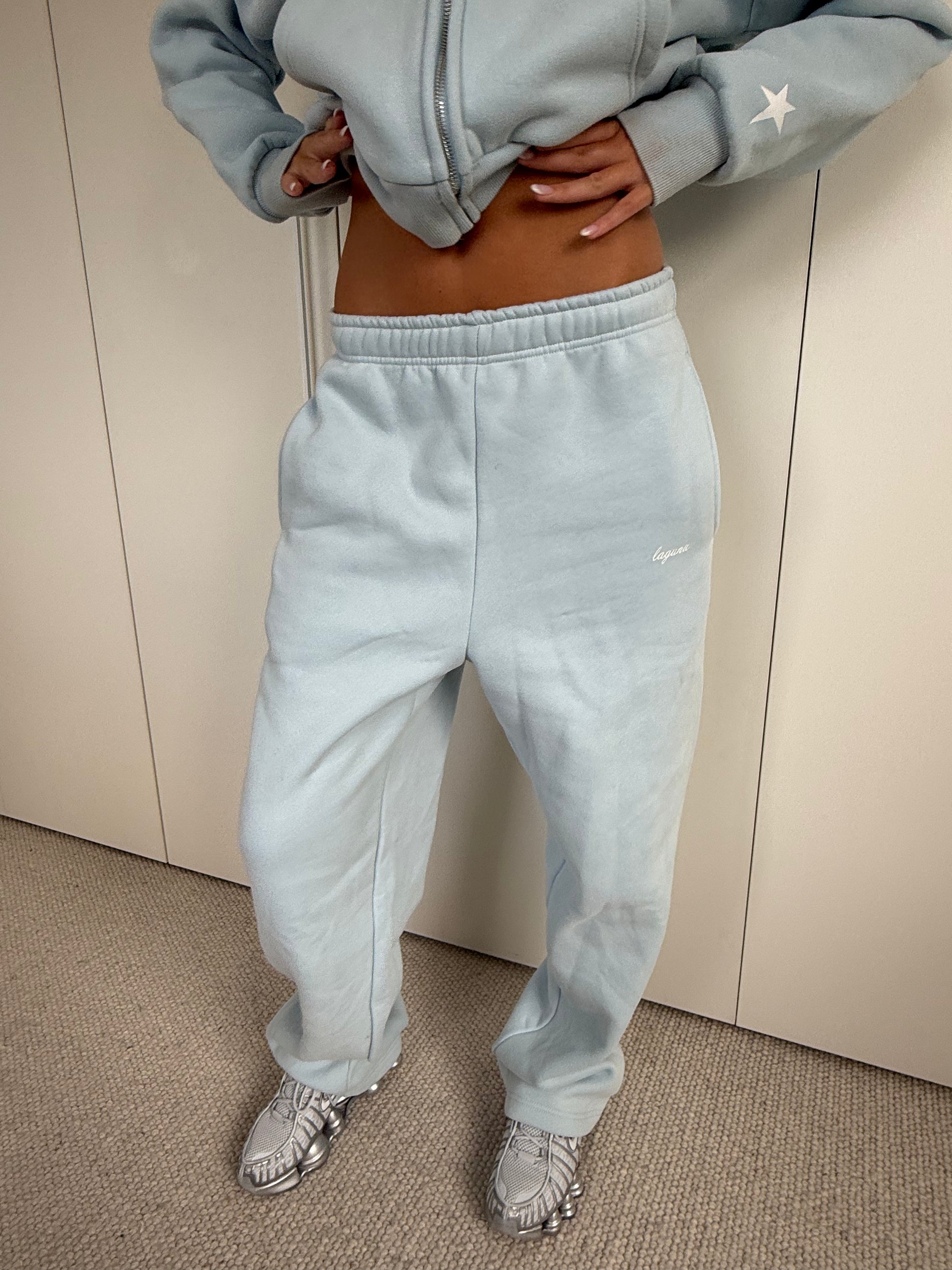 Our overzied track pants are perfect for adding a comfy touch to your casual wardrobe. These trackies can be worn both low waisted and high waisted depending on your desired fit. It includes a subtle 'laguna' print an the left leg. Crafted from a premium 350gsm fleece fabric, these trackies ensure warmth and durability. Additional features include deep side pockets and an elasticised waistband with a drawstring.